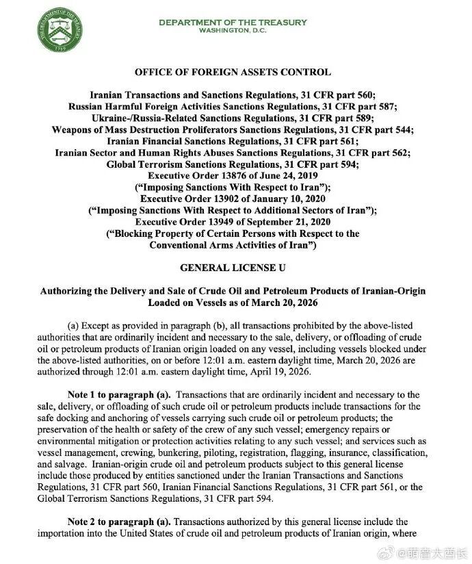 美国财政部正式发文,解除到3月20日为止的对伊朗已装船石油的制裁。