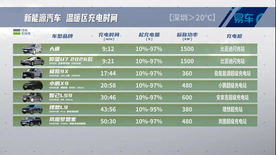 看看表格里的对比,更直观。在常温下,比亚迪闪充车型最快(8分多钟)。到了极寒环境,除了比亚迪的几款车时间稳定在10分钟左右,其他车型的充电时间普遍大幅增加,有的甚至超过了一个半小时。