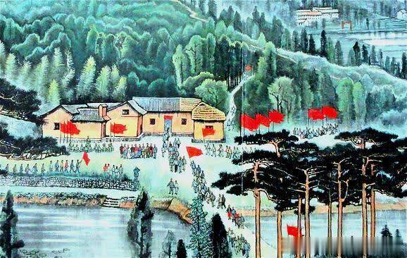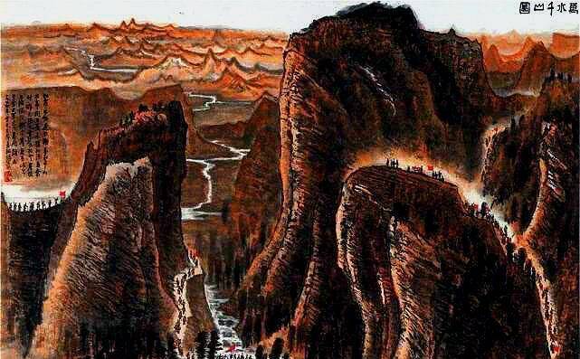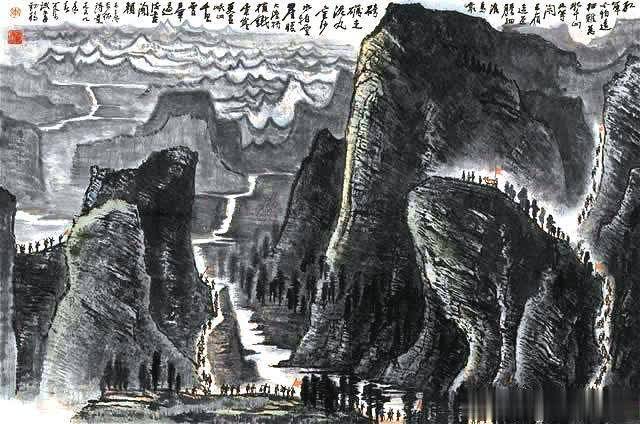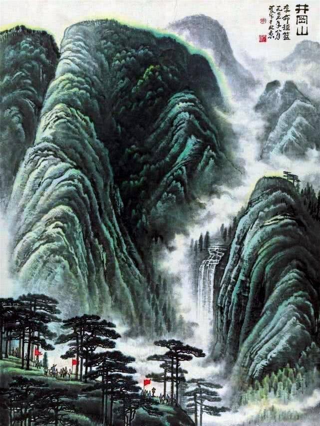 比如《长征》(见上图)这幅画,是根据一首七律诗《长征》,描绘了“红军不怕远征难,万水千山只等闲”的画面。用巍峨的高山,陡峭的山路,和望不到尽头连绵不绝的群山,以及一支时隐时现其中的队伍,来体现长征的豪情壮志,一股强大的气息从画面中扑面而来。这幅画在中国嘉德二零一零秋拍上,拍出来 1.075亿。