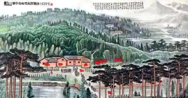第三幅《韶山》(见上图),以横式构图,描绘了清晨太阳还未出来的韶山的景象。远处是弥漫着雾气的青山,近处一潭池塘,边上是碧绿的松树,整个画面让人有一种温馨的感觉。在中国嘉德二零一二春拍上,以1.242亿成交。