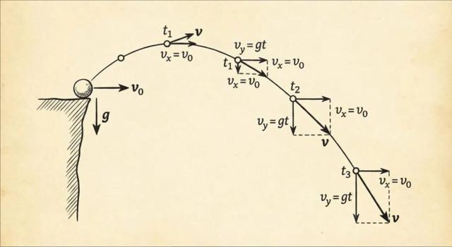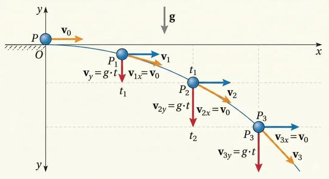 然后我又让它们给我画了一张高中物理课本风格的插图,展示小球的平抛运动轨迹。清晰标注初速度 v0(水平方向)和重力加速度 g(垂直向下)。