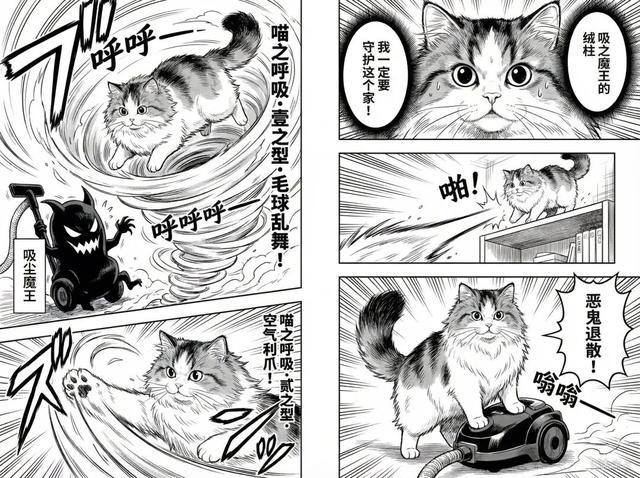 包括我给到它的部分,可以指定它想要的那种漫画风格。我给到它我们家小猫的照片,让它们做一个鬼灭之刃画面风格的冒险漫画,也是 Banana 2(右)的画面细节会更多一点,设计的剧情也更丰富一些。